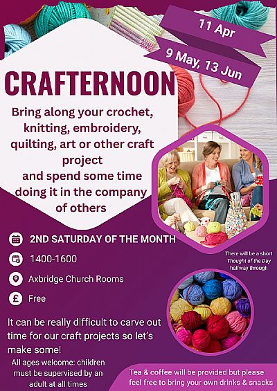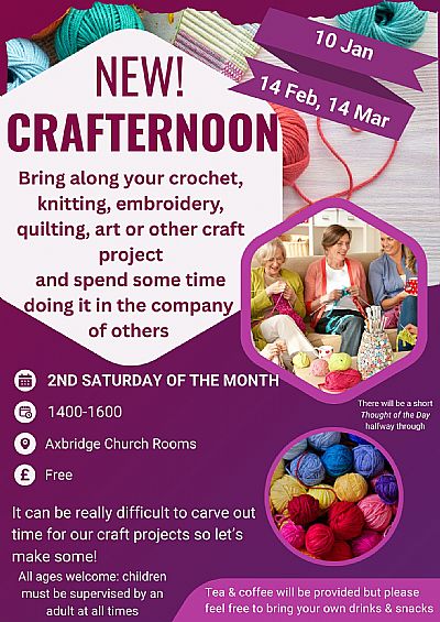 This runs on the second Saturday of the month in the Church Rooms. An opportunity to spend some time doing your chosen craft and chatting to others. There is a brief, five-minute, Thought of the Day halfway through. We have (accompanied) children and adults of all ages attending.